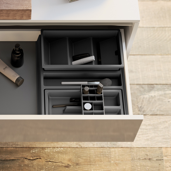 Each grid can be equipped with tissue box, small tray, cosmetic holder and small boxes with lid (the selection of accessories varies according to the combination of widths and depths).