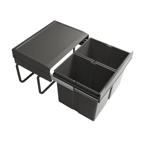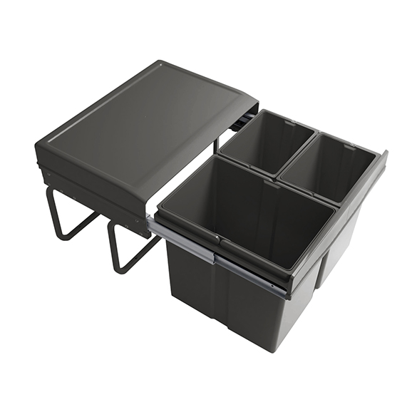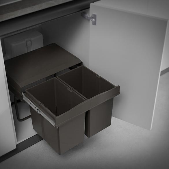Contenitori per la raccolta differenziata, ideali per spazi con profondità ridotta. Dimensioni compatte, grande capacità (30L) ed installazione rapida sotto qualsiasi tipo di lavello. Il coperchio consente l’appoggio di guanti, spugne e piccoli oggetti. Dotato di speciali guide ad estrazione totale.
