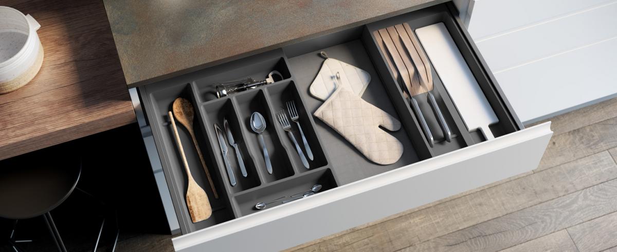 I moduli disponibili consentono di creare numerose varianti di prodotto adattabili a differenti larghezze di cassetto. Combi è resa ancora più funzionale dalla possibilità di accessoriare i moduli con portacoltelli e tagliere.