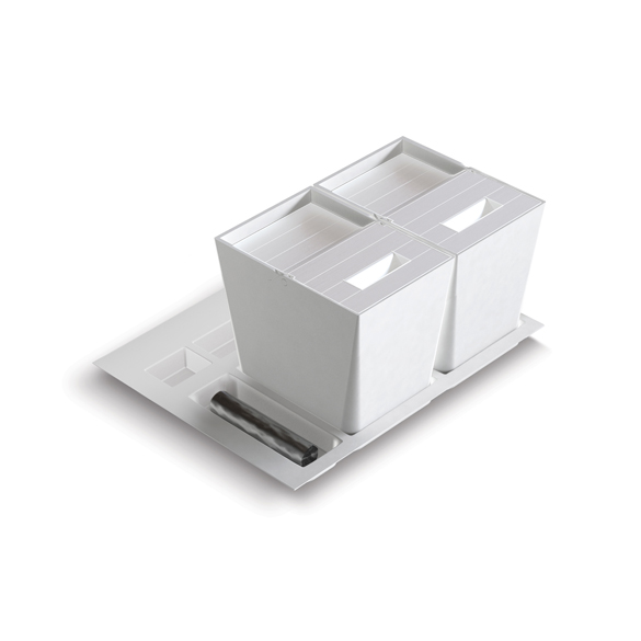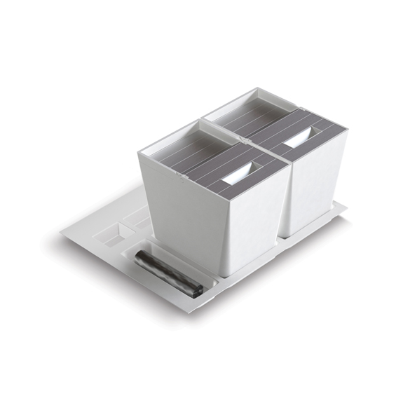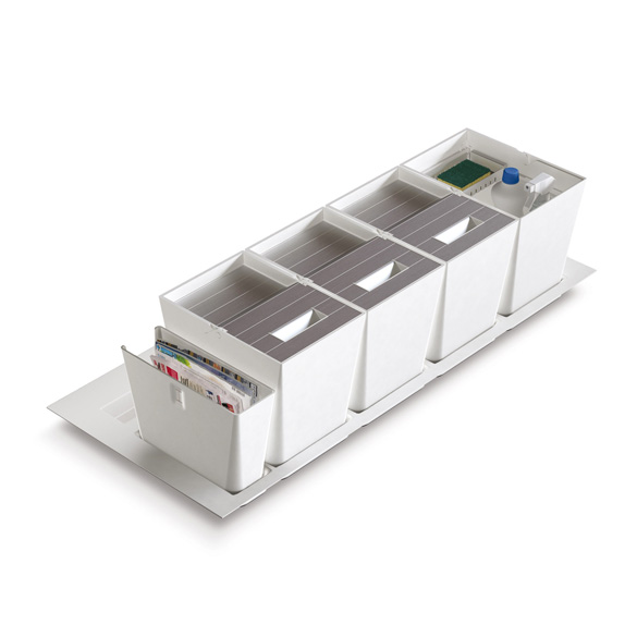 Il vassoio che ospita i secchi è rifilabile a misura e per le profondità maggiori sono disponibili compensatori di profondità in acciaio inox.